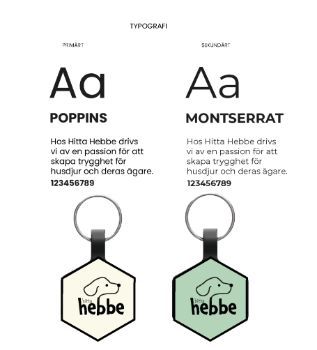 Skapa en grafisk profil för Hitta Hebbe som reflekterar varumärkets värderingar och känsla. Den grafiska profilen ska vara modern, enkel att använda i olika kanaler och skapa en stark koppling till trygghet och husdjurens värld. En huvudlogotyp som representerar Hitta Hebbes varumärke. En symbol som kan användas separat eller i kombination med huvudlogotypen. Logotypen ska förmedla trygghet, teknik och kopplingen till husdjur. En färgpalett som skapar en känsla av säkerhet och lekfullhet. Färgerna ska fungera i både digitala och tryckta medier. Förslag på primärt och sekundärt typsnitt som är läsbara och passar varumärkets ton. Typsnitten ska fungera för både rubriker och brödtext och vara lättillgängliga för webb och tryck. Modern och teknikorienterad, men med en varm och lekfull känsla. Tydlig och igenkännbar, så att varumärket enkelt kan identifieras. Ska appellera till husdjursägare som värderar säkerhet och omsorg om sina fyrbenta vänner